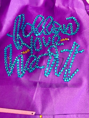 Back in the classroom, we focused on adding fine details to the aprons. Participants worked carefully with fabric markers, using small stencils, outlining tools, and rhinestones to create personal designs that reflected their style and joy.